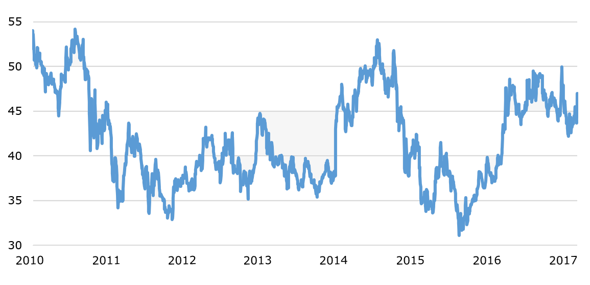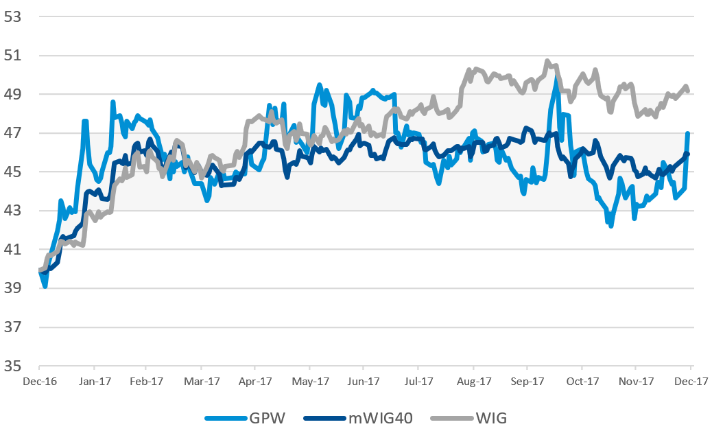 The GPW stock price ranged in 2017 from PLN 39.06 (2 January 2017) to PLN 49.98 (17 October 2017). The stock price was PLN 46.99 at the end of 2017, compared to PLN 48.82 as at 30 June 2017 and PLN 39.93 as at the end of 2016, gaining 17.7% during the year. Including the dividend of PLN 2.15 per share, the total shareholder return in 2017 was 23.1%. In the same period, the GPW mid-cap index mWIG40 gained 14.7%, and the broad market index WIG gained 23.2%.